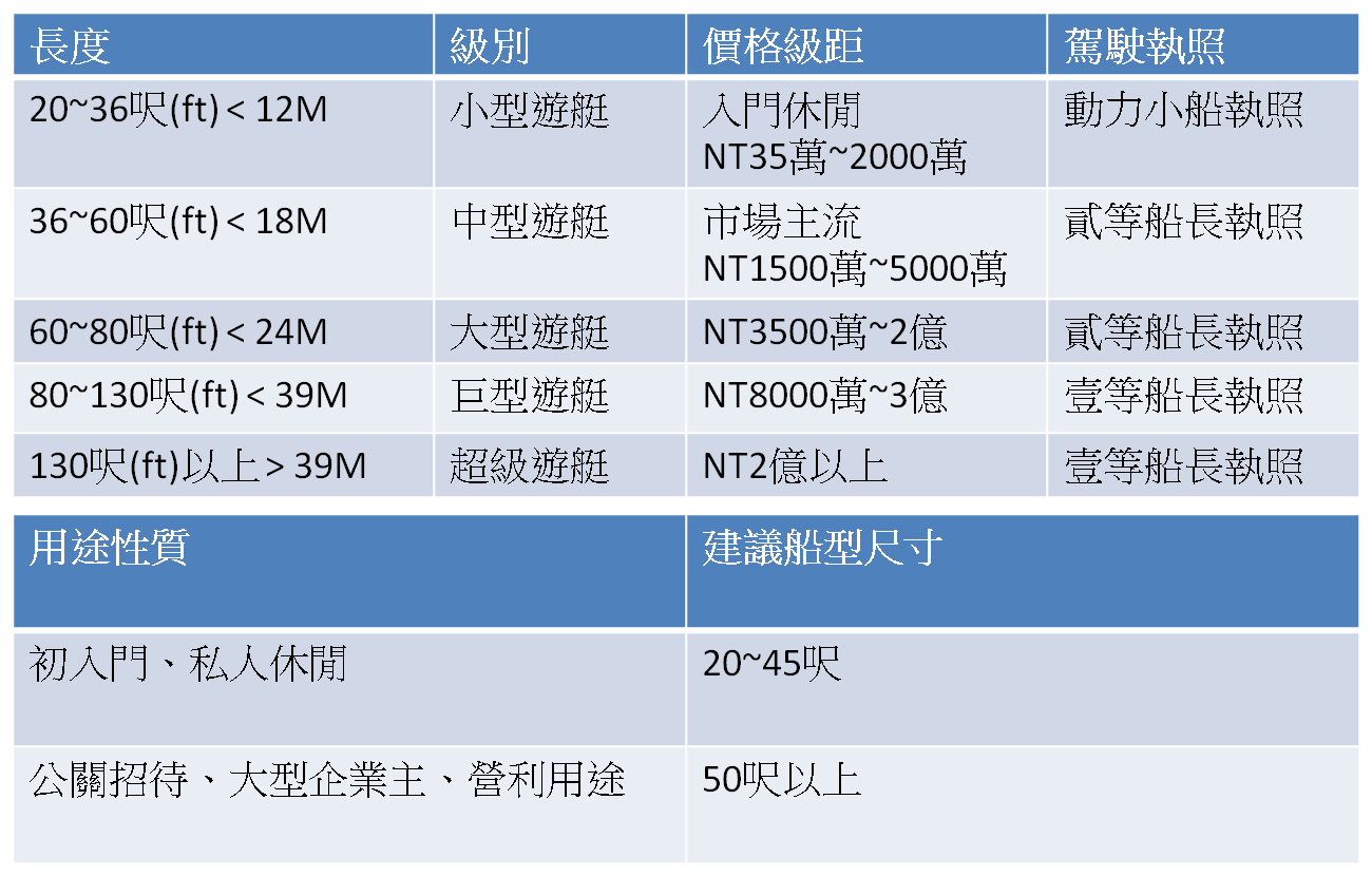 如果主要是私人用途,如家族聚會、朋友聚會等等,可以考慮中型遊艇(約36~60呎),若作為商務招待之用則須考慮中大型以上的遊艇(60呎以上),或選擇如長征型(多層式)或雙體遊艇...等,這些使用空間更大的船體設計。